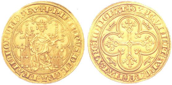 Il est très difficile de différencier une monnaie de Philippe III (qui a régné de 1270 à 1285), d’une monnaie de Philippe IV, si ce n’est que jusqu’en 1280 PHILIPE ne prenait qu’un P … et comme la seule monnaie d’or attribuée à Philippe III est légendée PHILIPP’… l’incertitude demeure..